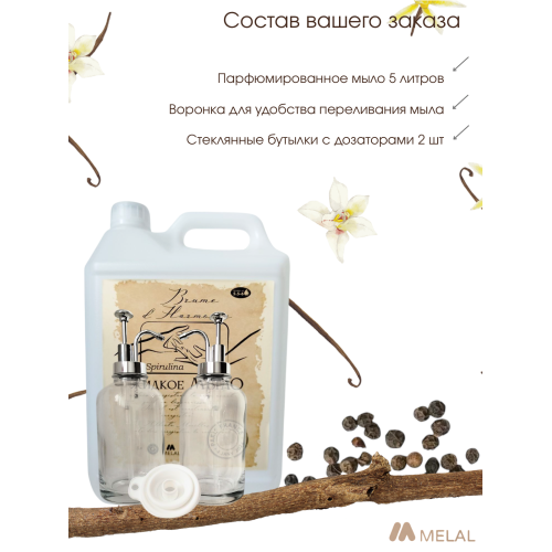 В наборе с 5 л канистрой будут 2 стеклянные баночки по 500 мл с изысканными дозаторами и воронкой для переливания мыла!